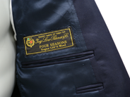 KOSTYM, LORO PIANA, mörkblå enkelknäppt med fyra kissingbuttons, två kavajfickor, dubbelslits, byxor utan slag med bakfickor, storlek 53, tillverkad i Italien