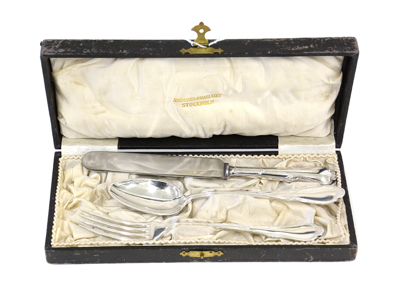 Bestick, Berndorf 3 delar, 1 gaffel, 1 kniv, 1 sked, okänd metall i ask