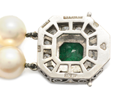 PÄRLCOLLIER, 79 st odlade saltvattenspärlor, 2-radigt, ca 9,00 mm, lås i 18K vitguld, smaragdslipad smaragd, 12 briljantslipade diamanter ca 0,70 ctv, ca TW/VS-SI, radernas längd 40 cm respektive 44 cm, handgjort av Sven Sebling, Göteborg år 1965, en diamant är skadad,