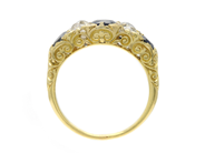 RING, 18K guld, tre ovalt fasetterade blå safirer ca 1,71 ctv, två gammalslipade diamanter och 8 rosenstenar ca 0,75 ctv, ca TCR-CR/VS-SI, stl 17+ mm, vikt 5 g, nagg på en av de gammalslipade diamanterna, rosenstenarna har skador.