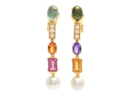 BVLGARI, örhängen, Allegra, 18K guld, rosa och grön turmalin, ametist, citrin, blå topas, 6 briljantslipade diamanter ca 0,24 ctv, ca TW/VVS, 2 odlade saltvattenspärlor ca 8,00 mm, Ref.OR852108, längd 4,5 cm, vikt 13,9 g, stift/clips.