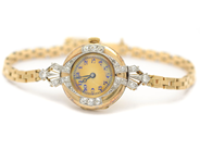 DAMUR, 20,5 mm, Boett nr. 275098, 18K guld, manuell, plexiglas, skadad urtavla, diamanter på boett och länk (30 st. ca 0,50 ctv, ca W-TCa/SI), integrerad länk, totalvikt 18,3 gram, ca 1940, etui (Rob. Engström, Hamngatan 10).