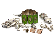 Parti Silver 830/1000 (=Bältesspänne i 2 delar, Armband, del av Collier, 1 par Örhängen, 1 par manschettknappar med monogram, 2 udda Örhängen, Ring defekt), 175,9g