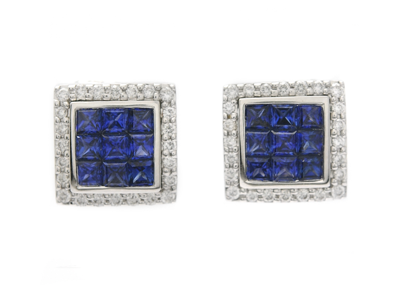 GOLDEN LADY, örhängen, 18K vitguld, 18 carréslipade blå safirer ca 0,24 ctv, 48 briljantslipade diamanter 0,20 ctv enligt gravyr, ca W/VS, läng 0,7 cm, vikt 4,4 g, stift.