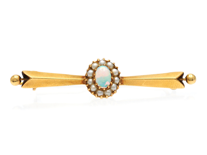 BROSCH, 18K guld, opal, orientaliska pärlor, längd 5 cm, vikt 3,2 g, opalen skadad.
