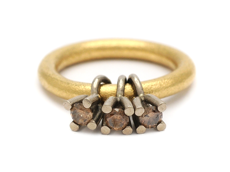 RING, 18K, guld, 3 bruna brilj ca 0,45 ctv, 1 skadad, Sandberg, originaletui, vikt 9,9 g, stl. 17,5 mm vikt 9,9 g