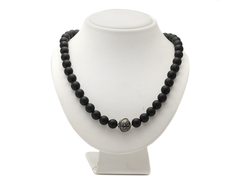 3 COLLIER + 1 LÅS, 10 mm stenkulor, rosa, gula och svarta med dobbar, längd 44, 44 och 47,5 cm respektive,, 13,6 mm lås från Guldfynd i svärtat silver med guldrand, (låset glipar en aning), Ole Lynggaard etui.