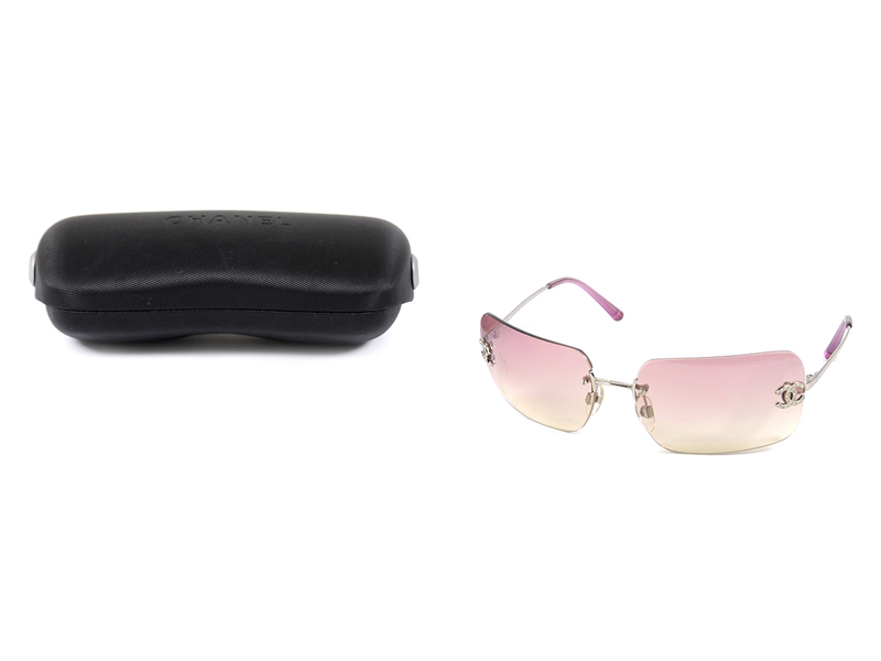 SOLGLASÖGON, CHANEL, 4017-D 124/58 62 17120 skalmar i vitmetall, lju rosa/lila glas, putsduk, originalkartong.