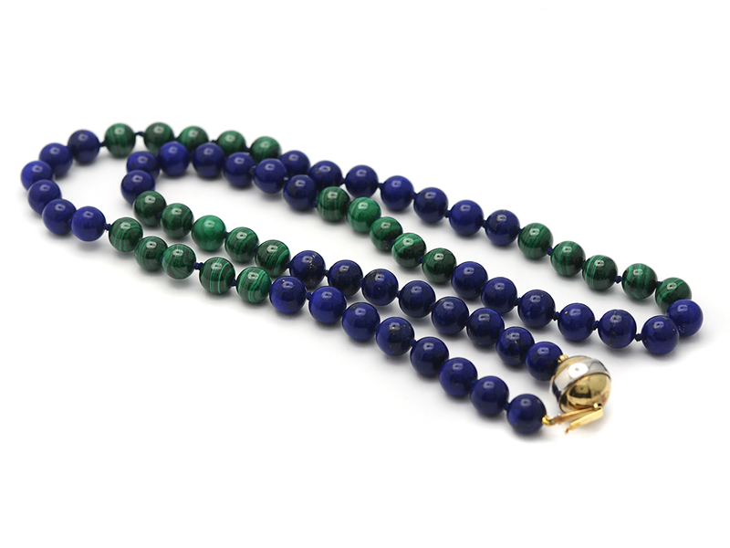COLLIER, lapis lazuli, malakit, kulor 8 mm, lås i silver, längd 63 cm.