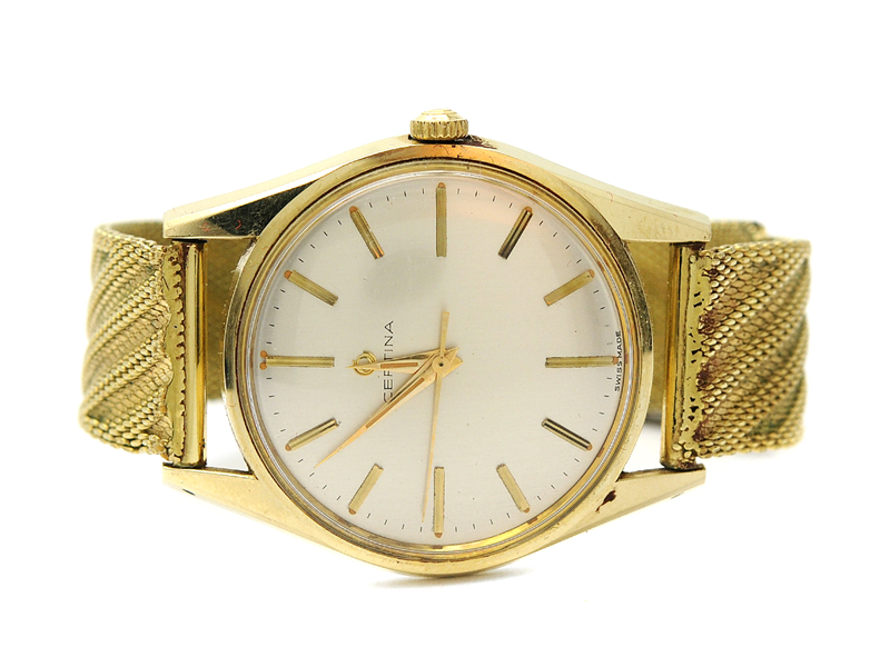 CERTINA, herrur, 34 mm, Cal 23-36, Serie nr. 4209118, Boett nr. 5127.014, guld på stål, manuell, plexiglas, skadad urtavla, ca 1962, metallänk ej original, box.