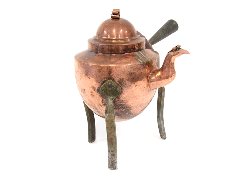 Kittel på ben i koppar, ben och handtag i metall, höjd ca 24cm, bucklor