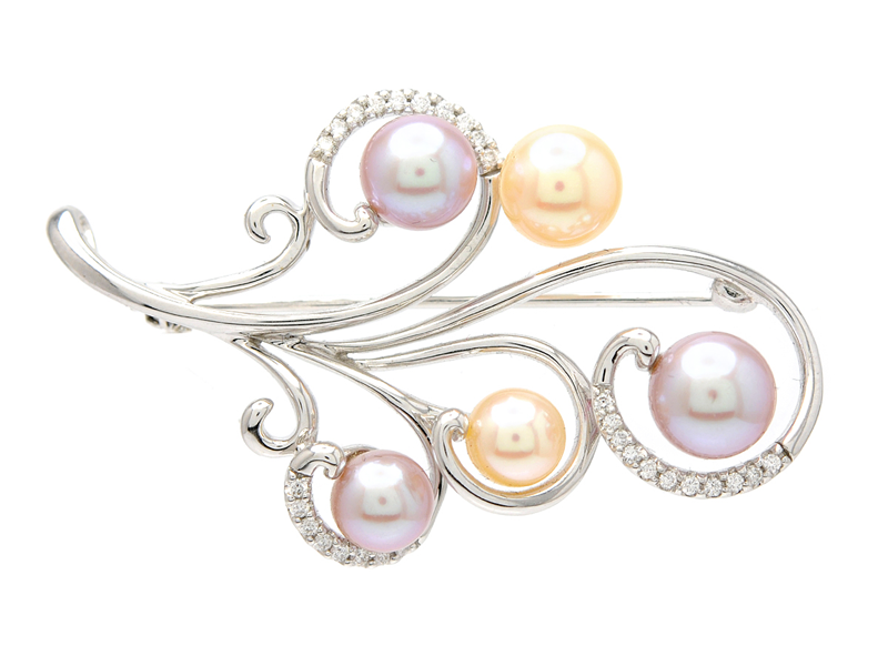 BROSCH, 18K vitguld med odlade sötvattenspärlor 6-7 mm, 29 briljantslipade diamanter 0,21 ctv W/SI, 4,9 x 3 cm, vikt 11,8 g.