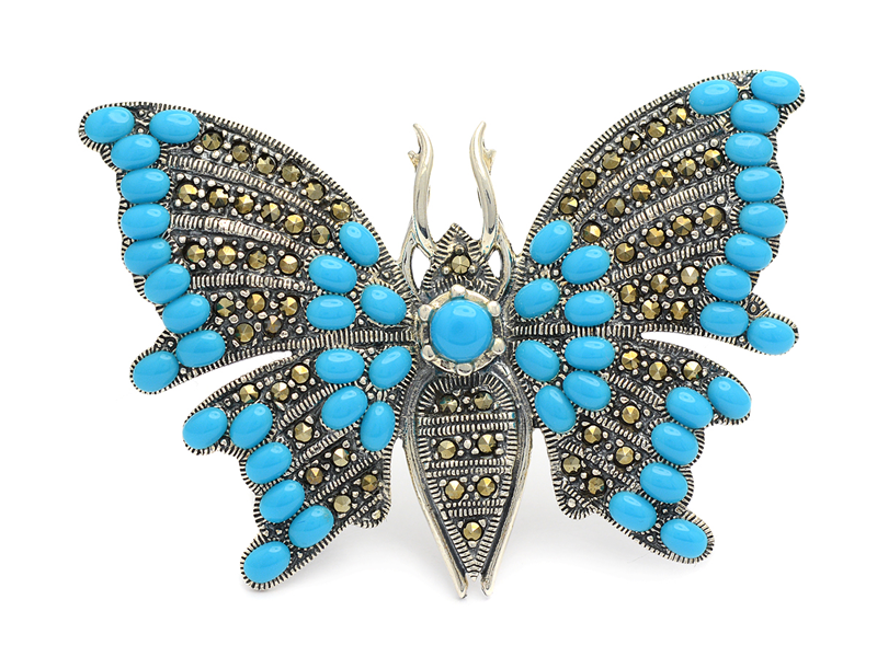 BROSCH, sterlingsilver, markasiter, turkos, fjäril, ca 5,5X4,5 cm, vikt 21,7 g.