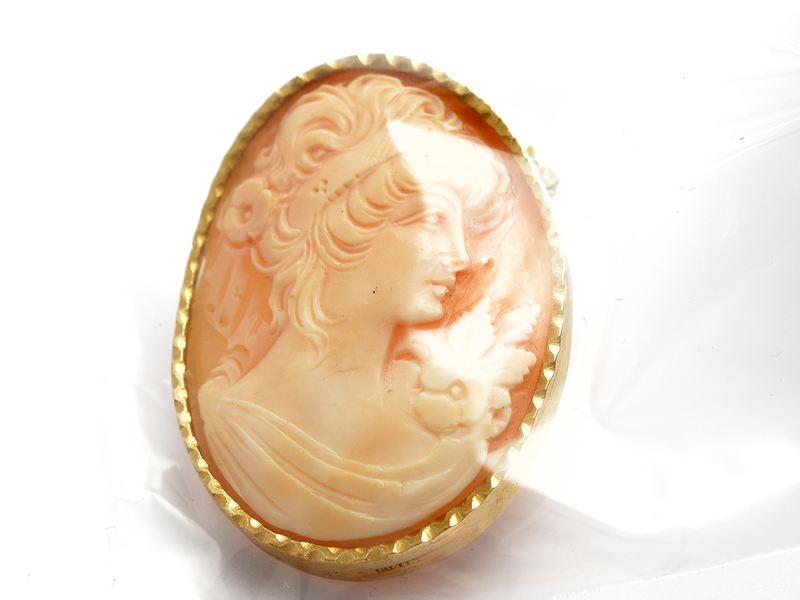 Brosch 18K bruttovikt 13,6g med Camé, defekt, nål ej guld