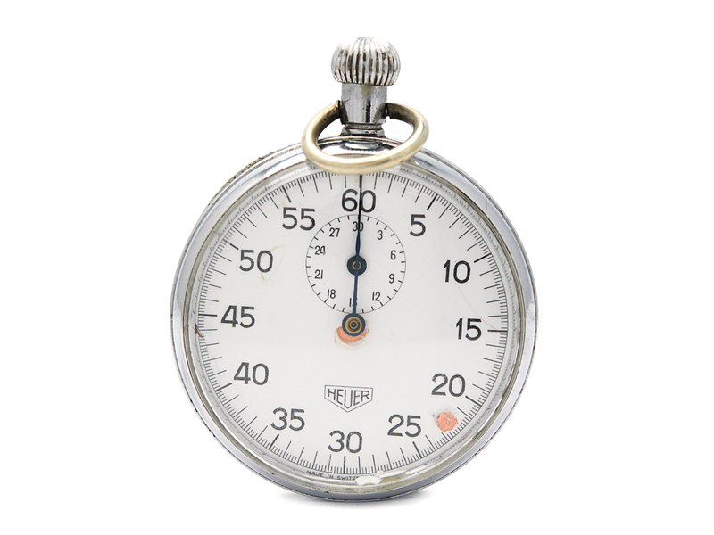 HEUER, stoppur, 51 mm, Serie nr. 877981, Boett nr. 886486, 60 sek / 30 min, vitmetall, mekanisk, skadad urtavla, defekt, ca 1975.