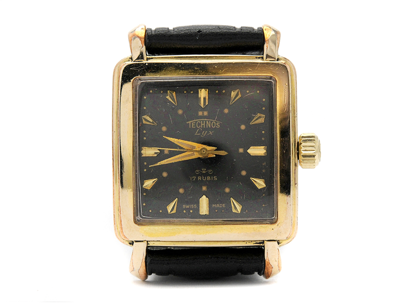 TECHNOS, Lyx, Boett nr. 162419, herrur, 28,5 x 29,5 (39,5) mm, doublé (20 micron), manuell, plexiglas, skadad urtavla, läderband, ca 1955.