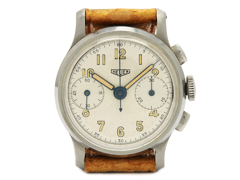 HEUER, kronograf, Cal Landeron 13, Boett nr. 41110, herrur, 32 mm, stål (staybrite), manuell, plexiglas, defekt, läderband, ca 1940.