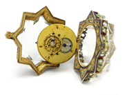 CHAUDOIR, à Genève, stjärnformat, fickur, 50,5 x 67 mm, förgyllt silver, spindelgång, boett med emalj och bergkristall (flisa), boett signerad HB, ca 1800, nyckel.