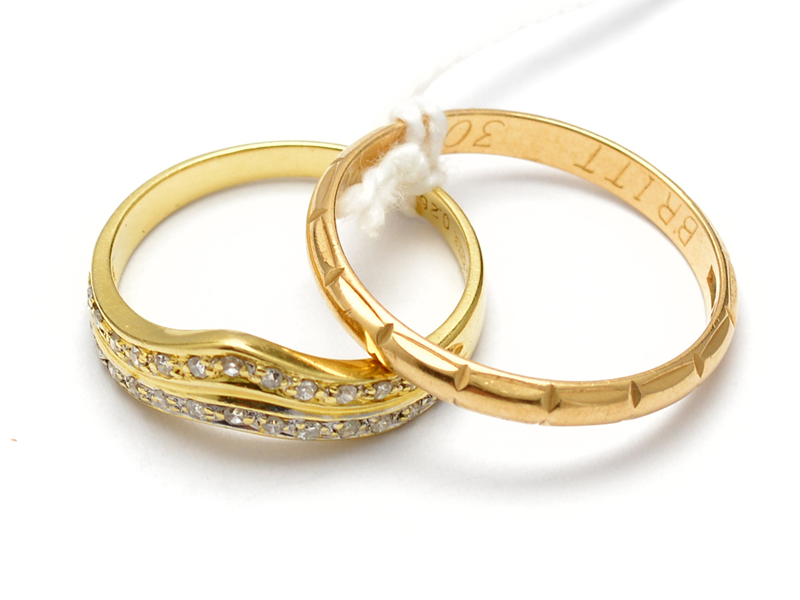 Ringar 18K Ø18, Ø20¼, 5,8g, defekta, varav 1 med små diamanter & 1 med gravyr