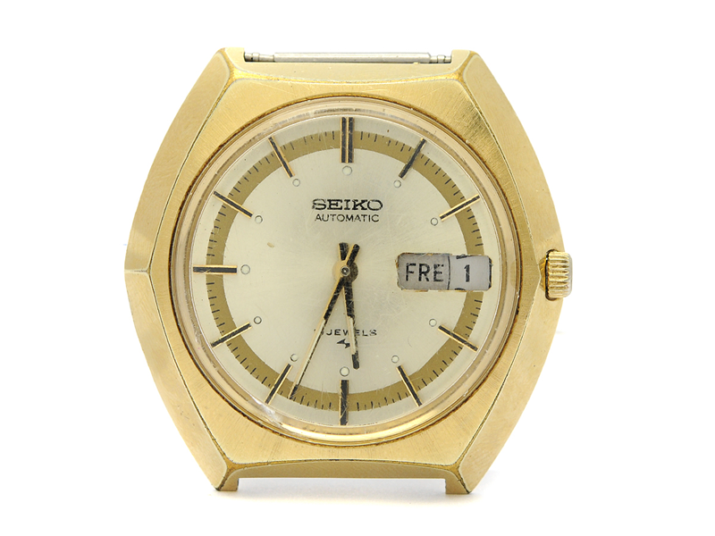SEIKO, herrur, 38 mm, Cal 7006A, Serie nr. 420545, Boett nr. 7006-7180, gulmetall, automatisk, plexiglas, dag, datum, skadad urtavla, defekt, ca 1974.