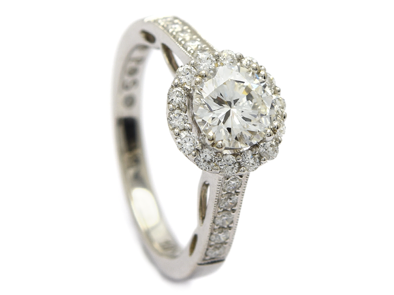 RING, 18K vitguld, briljantslipad diamant 1,05 ct, River(E)/SI2, HRD certifikat 15016425001, 24 briljantslipade diamanter ca 0,50 ctv, TW(F-G)/VS-SI, stl 17,25 mm, vikt 4,8 g.