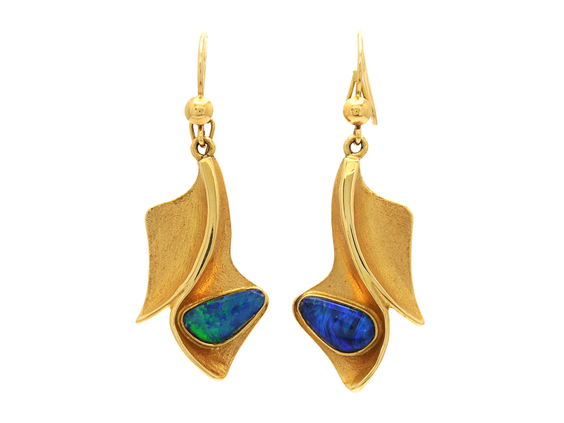 ÖRHÄNGEN, 18K guld, svarta opaler, Timo Narkasakka Örebro 1991, krokar, längd 5 cm, vikt 12,4 g.