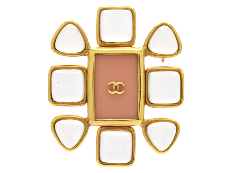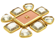 BROSCH, CHANEL, vintage, gulmetall med glasstenar, korallfärgad platta, märtkt 96 (CC märket) P.
