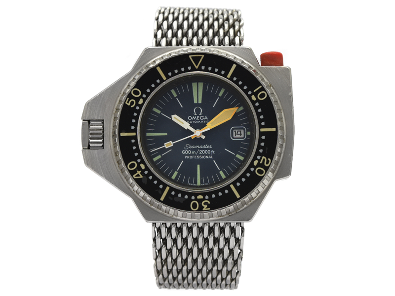 OMEGA, Seamaster (600m/2000ft), Professional, s.k. "PloProf", "Type III", Cal 1002, Serie nr. 33134144, Ref nr. ST 166.0077, Boett nr. 166.077, herrur, 55 x 45 mm, stål, automatisk, mineralglas, datum, skadad klickring, originallänk, Ref nr. 1266/237, längd 185 mm, ca 1972.