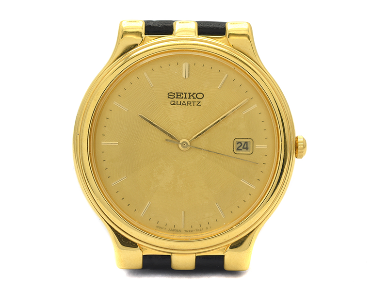 SEIKO, herrur, 34 mm, Cal 7N22, Serie nr. 461586, Boett nr. 7N22-7021 R1, doublé, hardlexglas, datum, skadad urtavla, läderband, ca 2004.