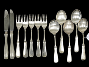 Bordsbestick kontrollstämplat silver 617,9g 2 Knivar 215mm 5 Gafflar 183mm 5 Skedar 187mm modell Uppsala bruksskick