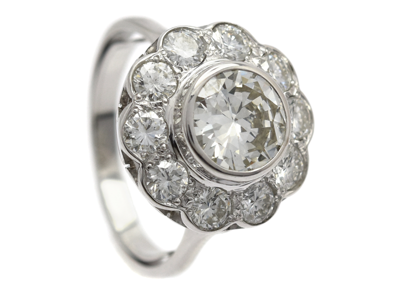 RING, 18K vitguld, briljant ca 1,80 ct, ca Cr(J)/SI1, 10 briljanter ca 1,60 ctv, ca TW-W/SI, stl 18,25 mm, vikt 6,8 g, storleksminskad via extra ringskena, mittsten med planslipad kulett samt aningen kortare lägre rondistfasetter.