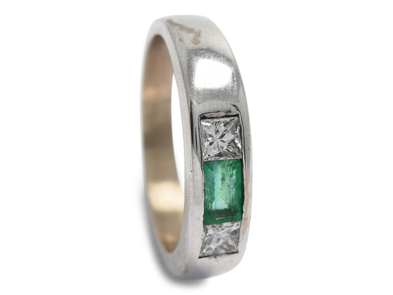 RING, 18K vitguld, smaragd 2 prinsesslipade diamanter ca 0,50 ctv, ca TW(G) SI, stl 18 mm, vikt 5,3 g, ena diamanten med litet nagg på bordet.