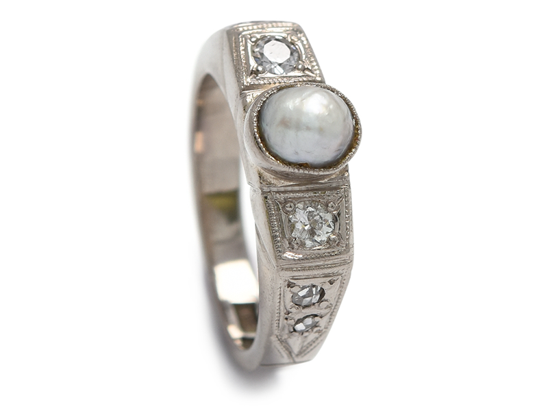 RING, 18K vitguld, troligen orientalisk pärla ca 5 mm, 2 briljantslipade diamanter ca 0,16 ctv, 4 rosenslipade diamanter ca 0,10 ctv, ca W(H)/SI1, stl 16,25 mm, vikt 8,7 g, en briljantslipad diamant skadad