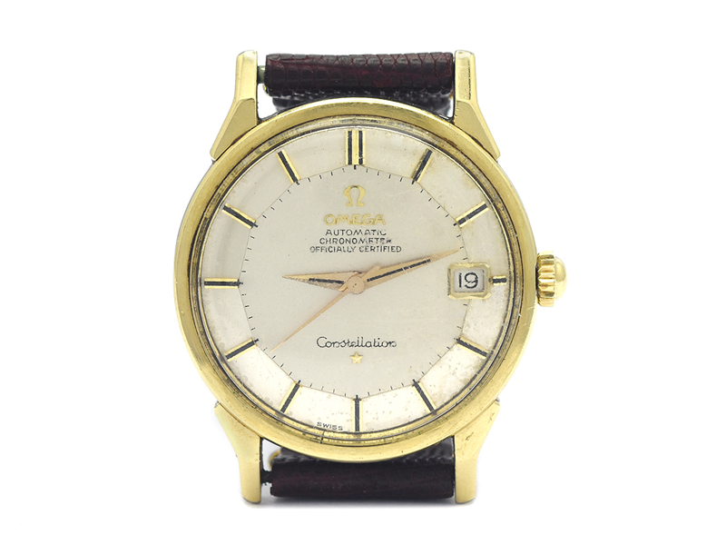 OMEGA, Constellation, Chronometer, s.k. "Pie-Pan", Cal 564, Serie nr. 24806658, Ref nr. CD 168.005, Boett nr. 168.005, herrur, 34 mm, guld på stål, automatisk, plexiglas, datum, skadad urtavla, läderband, ca 1966.