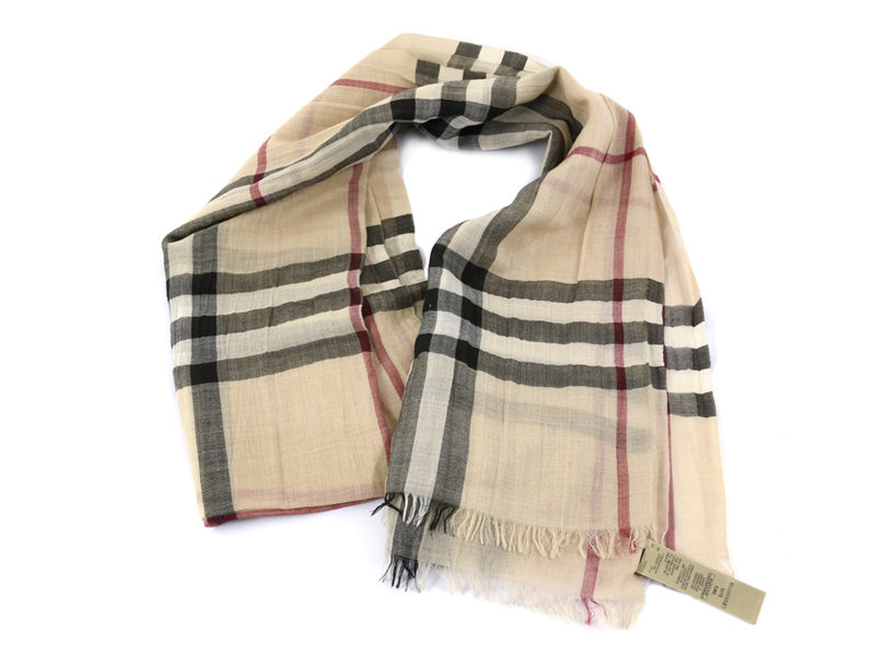 SCARF, BURBERRY, 51% ull, 49% siden, 220x70cm, beige, svart, rödrutig.