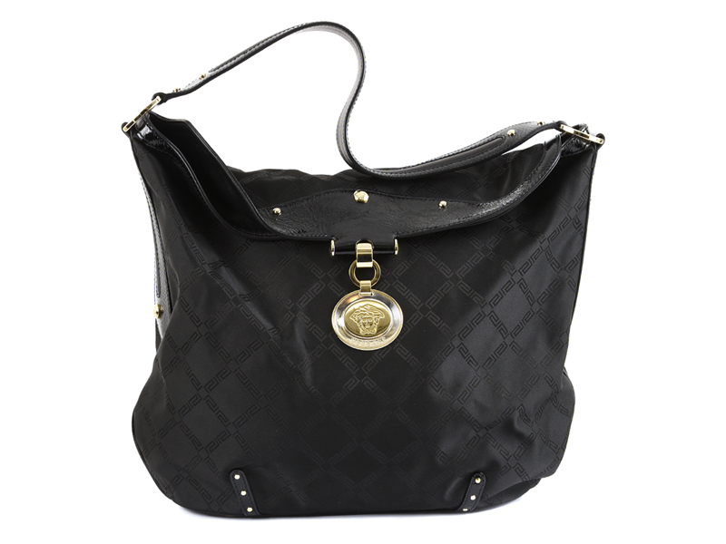 VÄSKA, VERSACE, svart tyg, svart skinn lack, gulmetall detaljer 29x32x9cm, kvitto, dustbag
