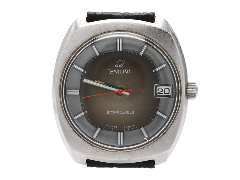 ENICAR, "Star Jewels", "Ocean Pearl", Cal A-R 160, Boett nr. 160-54-07 / 2375, herrur, 35 mm, stål, manuell, plexiglas, datum, skadad urtavla, läderband, ca 1975.