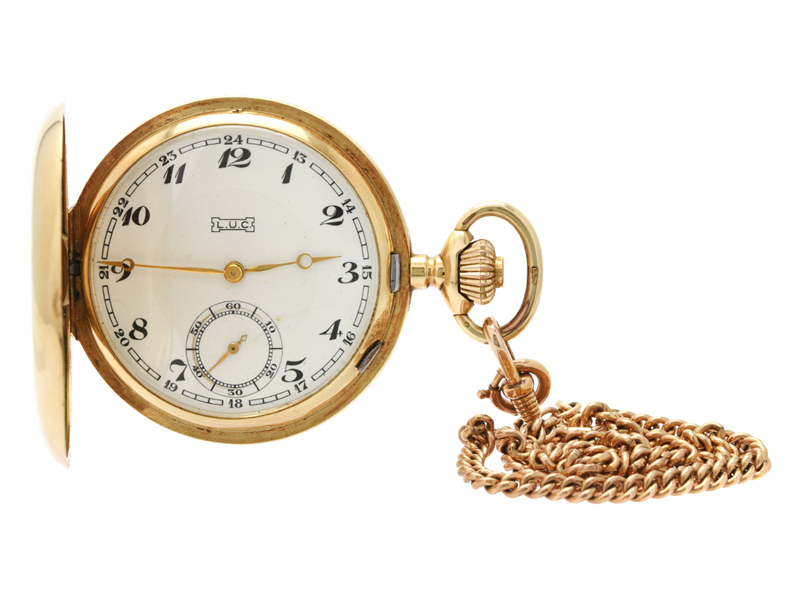 L.U.C, fickur, 51,5 mm, savonett, Boett nr. 51582 / 05, 14K guld, ankargång, skadad urtavla, gravyr, bucklor, ca 1930, fickurskedja i doublé,
