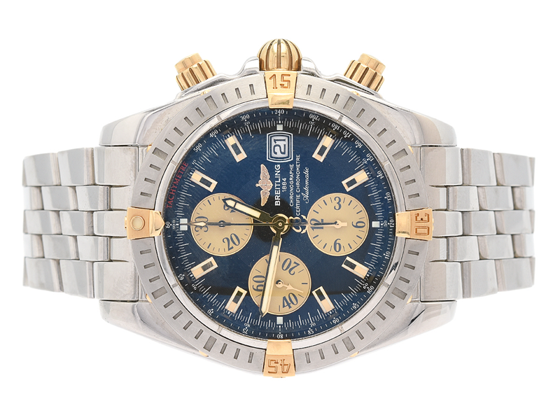 BREITLING, Chronomat Evolution, "Tachymetre", Chronometre, Cal 13 (ETA 7750), Verk nr. 798878, Serie nr. 798878, Ref nr. B13356, Boett nr. 2804 B4, kronograf, herrur, 43,7 mm, bicolour, automatisk, safirglas, datum, skadad urtavla, Pilotlänk (stål), viklås, Ref nr. C1804/357A, ca 2005, box, ytterkartong.