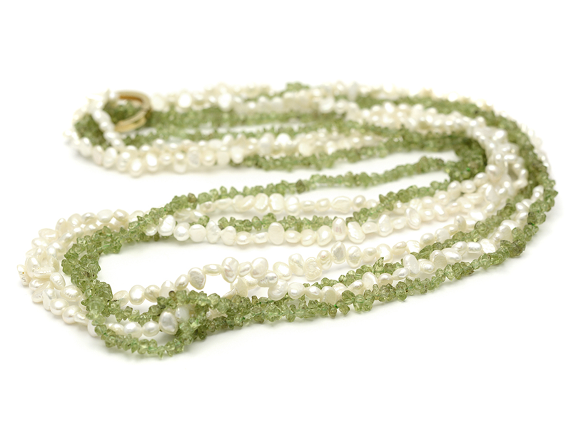 PÄRLCOLLIER, 2 rader, odlade sötvattenspärlor och peridoter, hålls ihop med en klämma i gulmetall.
