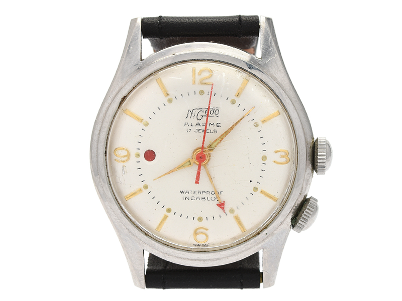 NIGEDO, Alarme, Cal Venus 230, Boett nr. 1960, herrur, 34,5 mm, stål, manuell, plexiglas, alarm, skadad urtavla, läderband, ca 1955.