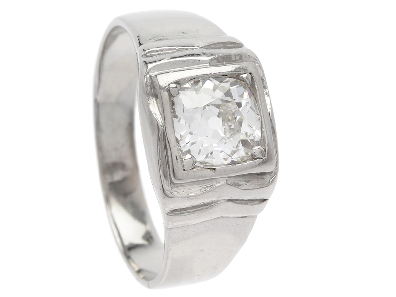 ENSTENSRING, platina, diamant ca 1,55 ct enl gravyr, gammal kuddslipning, ca W(H)/VS, mycket små nagg på rondisten, slitna klor, stl 20 mm, vikt 11,7 g, J.A. Persson, Stockholm 1943.