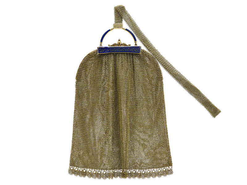HANDVÄSKA, 14K guld, stickad, blå emalj, Pest, Österrike/Ungern 1867-1922, vikt 144 g, emaljskada.