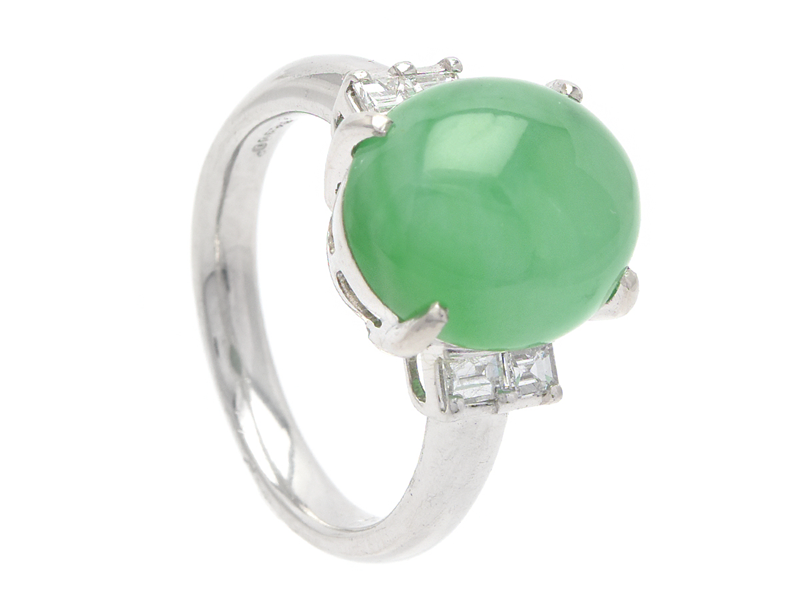RING, platina, cabochonslipad b-jade ca 7,24 ct, 4 baguettslipade diamanter ca 0,21 ctv, ca TW/VS-SI, stl 16 mm, vikt 7,6 g.