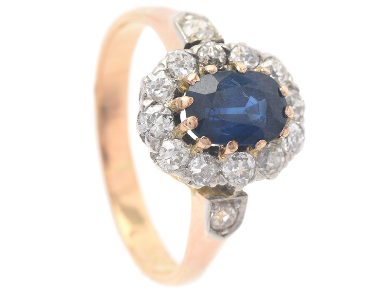 CARMOSÉRING, 18K guld/platina, ovalslipad blå safir ca 0,90 ct, 14 gammalslipade diamanter ca 0,40 ctv, ca W-TCa(H-K)/SI-P, stl 16,75 mm, vikt 4,1 g, små nagg på safiren, flera diamanter med nagg, utsliten fattning, skadad ringskena.