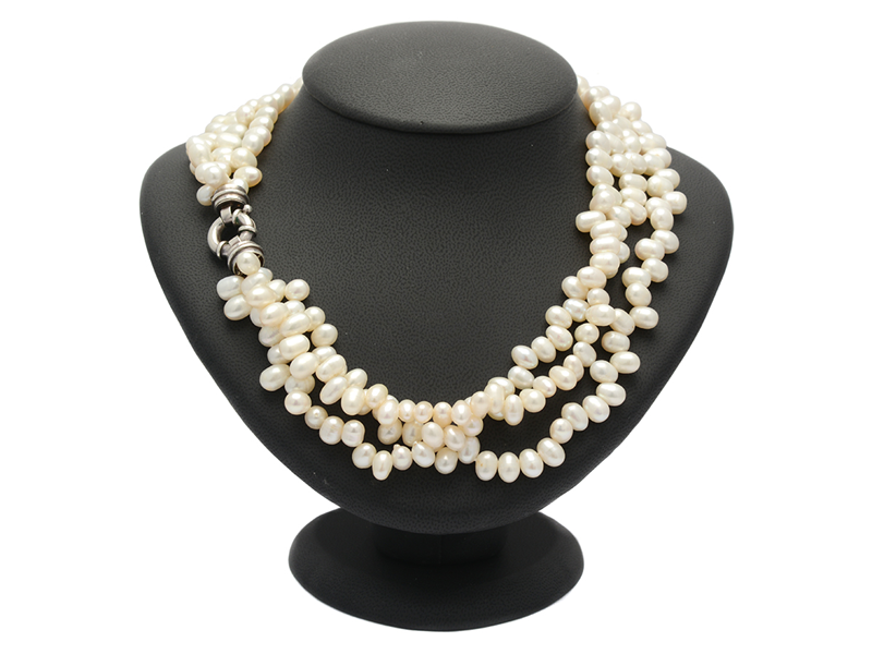 PÄRLCOLLIER, treradigt, odlade sötvattenspärlor, ca 8 x 6 mm, lås i sterlingsilver, längd 49 cm, vikt 124,1 g.
