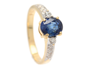 RING, 18K guld, ovalslipad blå safir ca 1,84 ct, 8 briljantslipade diamanter ca 0,20 ctv, ca Cr(J)/SI, stl 17 mm, vikt 3,7 g, safiren har nagg vid rondisten och slitna fasettkanter.