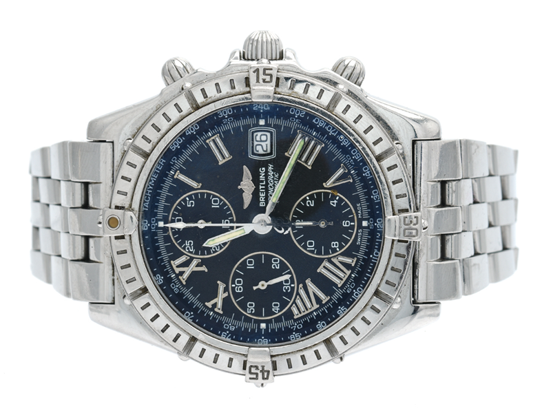 BREITLING Crosswind herrur, 43mm, automatiskt, stål med pilotlänk i stål (repig), safirglas, datum, kronograf, refnr: A13055 Serie nr. 6174 i behov av service, skadad urtavla, repor på glas