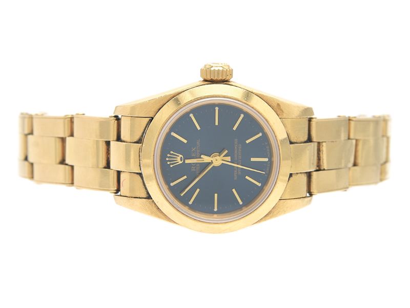 ROLEX, Oyster Perpetual (T Swiss Made T), Chronometer, Ref nr. 67188, Serie nr. U252161, Cal 2130, Verk nr. 3689253, Boett nr. 67000, damur, 25 mm, 18K guld, automatisk, safirglas (repor/nagg), skadad urtavla, Oysterlänk (Flushfit, storleksändras ej), viklås, Ref nr. 7204A-Z9/93 B, totalvikt 64,2 gram, ca 1997, box.