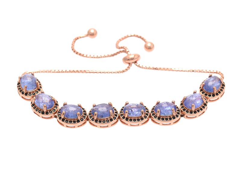 ARMBAND, förgyllt sterlingsilver, 8 cabochonslipade tanzaniter ca 10,00 ctv, troligen svart glas, ställbar storlek, vikt 11,9 g